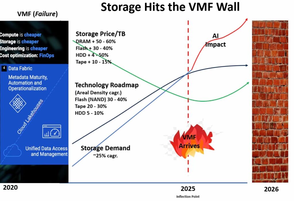 “Current HDD and tape development roadmap progress has fallen behind projected storage specifications and increasing demand,” Moore explained. “The VMF has created mounting storage supply shortages and higher prices across the board.”